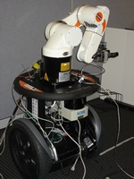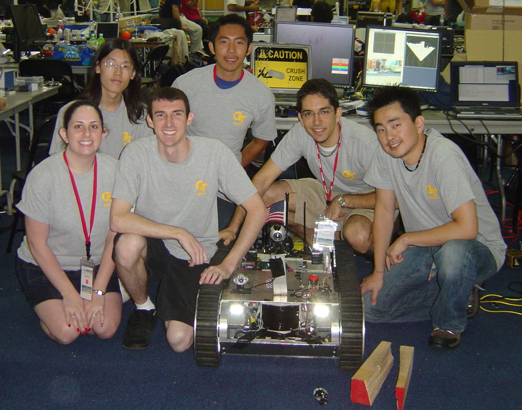 I have a bachelor's degree in mechanical engineering from Syracuse University, and a master's degree in computer science from Georgia Tech. Here are some of my interesting robotics-related school projects. Master's ProjectGeorgia Tech's entry in the 2007 RoboCup Rescue competition was my master's project. At 300 pounds, it was the largest competitor by far. Unfortunately, the size of the robot and low ground clearance prevented the robot from exploring much of the arena. I designed and machined almost the entire robot myself. I also did quite a bit of systems integration. Our goal was to have better video throughput by using 3 orthogonal radio frequencies. See paper: (RCom) Reliable Communications for Teleoperated Rescue Robots. Mobile ManipulatorThe goal for this project was to get this Kuka arm on a Segway RMP to serve coffee. My team chose to use Microsoft Robotics Studio for our software framework. I was responsible for the overall architecture of services. See paper: Mobile Manipulation - A Challenge in Integration. IPREMe in front of boxes of Scribbler robots for the IPRE project. I was the IPRE Research Fellow in 2006. Senior Design RobotI was the team leader of my mechanical engineering senior design project in which we built an eight legged hobby-servo driven robot. See report: Interdisciplinary Spider Robot Project. |